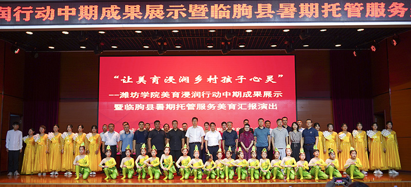 本网讯 8月19日上午,美育浸润童心,艺术点亮未来——潍坊学院、临朐县冶源小学、辛寨初级中学美育浸润行动阶段成果汇报会,在临朐县中小学生综合实践学校举办。我校党委委员、宣传部部长单振涛,教务处、音乐学院、美术学院负责同志以及潍坊市教科院、临朐县教体局相关负责同志出席活动。