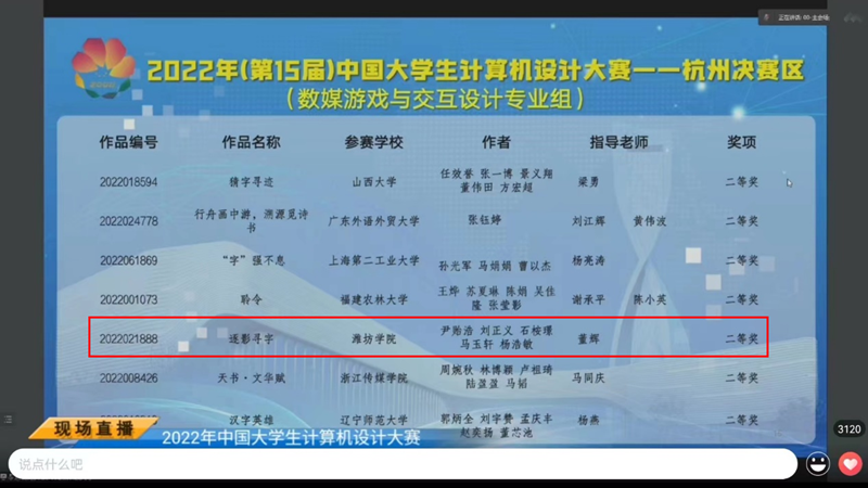 本网讯 近日,2022年(第15届)中国大学生计算机设计大赛暨数媒游戏与交互设计大赛(杭州决赛区)决赛于线上举行。由我校传媒学院董辉老师指导,2019级数字媒体技术专业学生尹贻浩、刘正义、石桉璟、马玉轩、杨浩敏制作的游戏设计作品《逐影寻字》获得数媒游戏与交互设计专业组二等奖。此外,传媒学院还有多项作品在省赛中获奖:《易学-在线平台教育》获一等奖、《年年有余》获三等奖、《百字阁火锅店室内设计》与《阁夜》获优秀奖。
