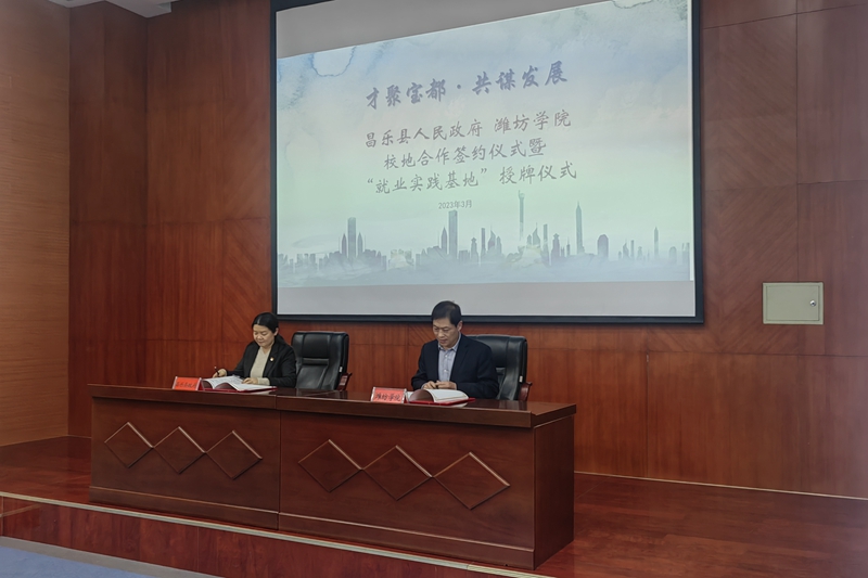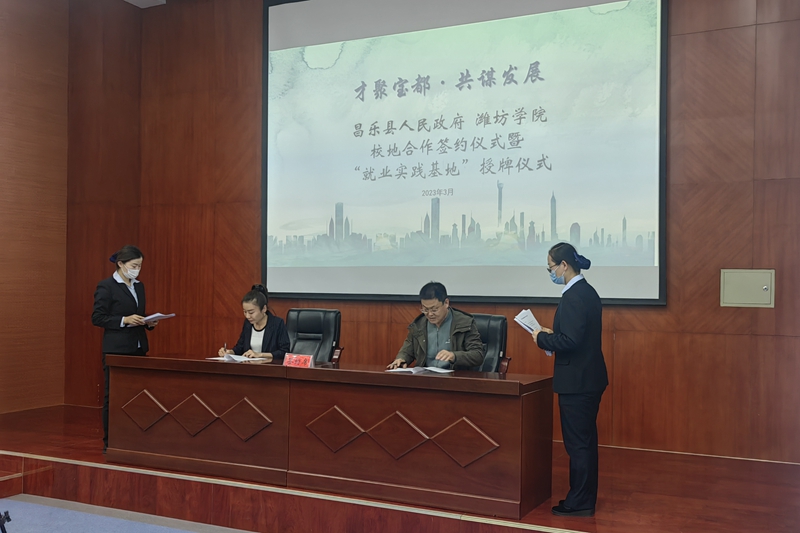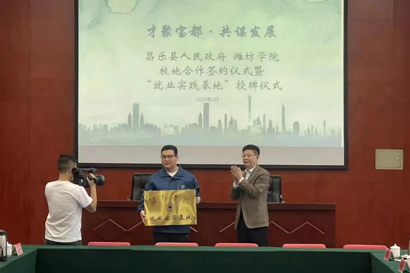 签约仪式上,王建新为签订就业实习基地建设合作协议的10家企业授牌。化学化工与环境工程学院负责同志代表学校与昌乐县签订了毕业生就业工作合作协议,与参会的10家企业代表依次签订了就业实习基地建设合作协议。
