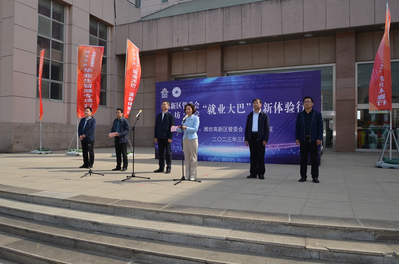 本网讯 为深入学习贯彻党的二十大精神,进一步落实“访企拓岗促就业专项行动”要求,促进毕业生高质量充分就业,3月31日,潍坊高新区管委会与我校联合举办“就业大巴”高新体验行活动。高新区党工委委员段守华、学校党委副书记徐梅出席活动并讲话。学校党委委员、宣传部部长单振涛主持。