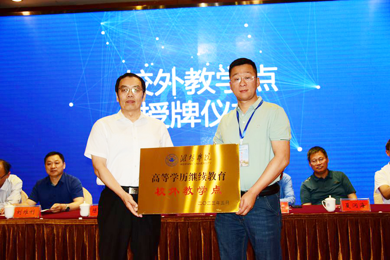 王旭升等与会领导向昌乐中智教育培训学校、日照市商业学校、潍坊高新区潍水教育培训学校等17家通过省教育厅严格审批的校外教学点,颁发了“潍坊学院高等学历继续教育校外教学点”铜牌。