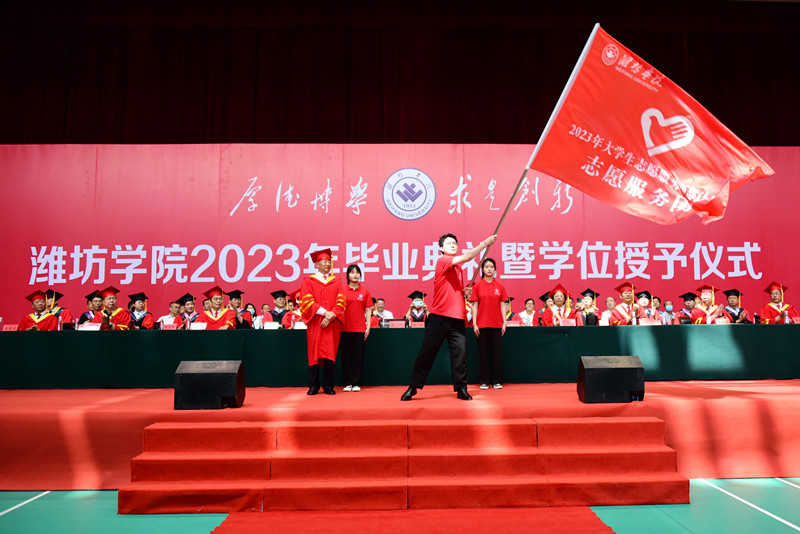 李东为2023年大学生志愿服务西部计划志愿服务团授旗。今年是西部计划实施20周年,学校全面贯彻落实国家号召,扎实开展2023年大学生志愿服务西部计划招募选拔工作,实现志愿者招募数量新突破,40名潍院学子即将以志愿之名,赴西部之约。