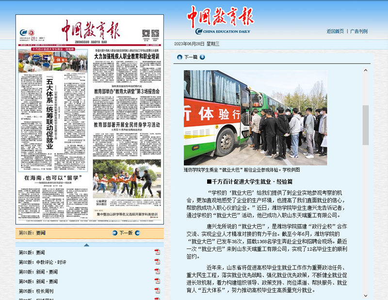 本网讯 6月28日,《中国教育报》以《“五大体系”统筹联动促就业——山东健全长效机制做好高校毕业生就业工作》为题在头版头条报道了山东省着力构建组织领导、政策支持、岗位渠道、帮扶服务、就业育人“五大体系”,努力推动高校毕业生高质量充分就业。其中,我校积极开展“就业大巴”职场体验活动被作为典型经验报道。
