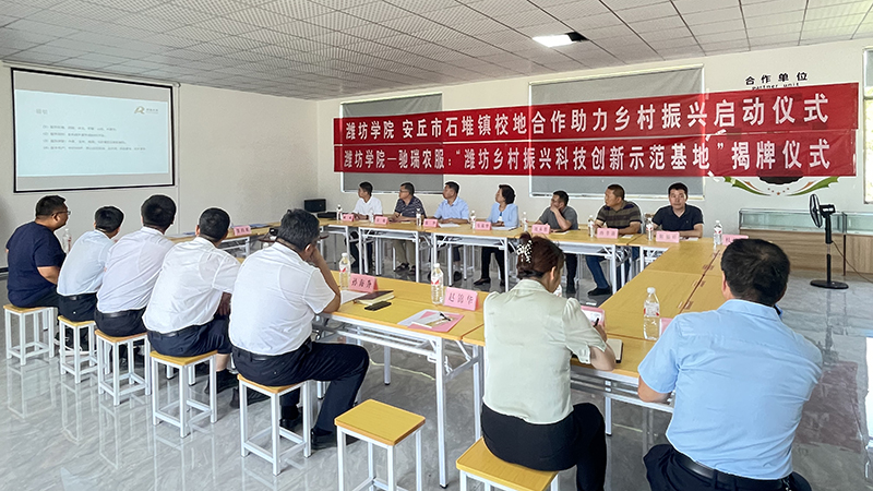 马茜华与山东驰瑞农业服务有限公司总经理李清华共同为“潍坊乡村振兴科技创新示范基地”揭牌,合作发展处负责同志与石堆镇党委副书记、镇长赵锦华签署乡村振兴创新发展校地合作协议,机械与自动化学院负责同志为山东驰瑞农业服务有限公司颁授“潍坊学院就业实习基地”牌匾。