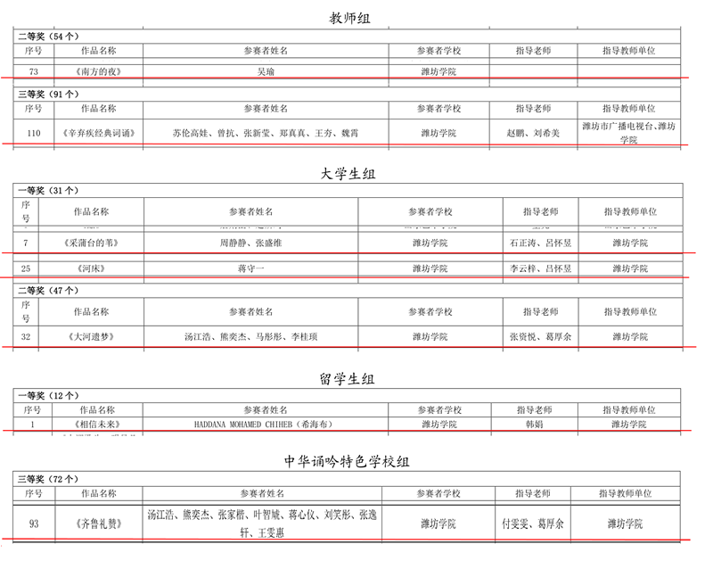 传媒学院吴瑜老师的作品《南方的夜》获教师组二等奖,外国语学院苏伦高娃老师团队作品《辛弃疾经典词诵》获教师组三等奖;传媒学院学生作品《采蒲台的苇》《河床》获大学生组一等奖、《大河遗梦》获大学生组二等奖;北海国际学院学生作品《相信未来》获留学生组一等奖;传媒学院学生作品《齐鲁礼赞》获中华经典诵吟特色学校组三等奖。其中,《采蒲台的苇》和《相信未来》两项作品被推荐参加国赛。