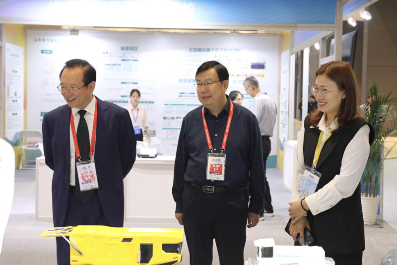 展会期间,第二十届中央候补委员、中国工程院院士、山东大学校长李术才,山东省高等教育学会会长罗公利莅临我校展位指导,肯定了我校纵深推进科教产融合创新、建设高水平应用型大学的做法。