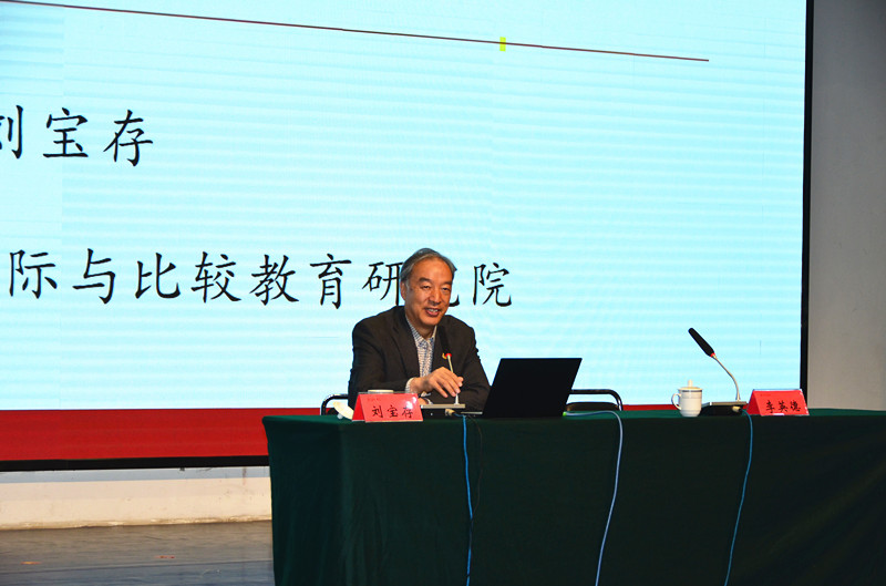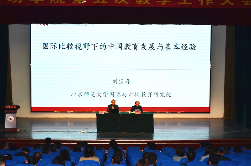 本网讯 10月19日,教育部长江学者特聘教授、国务院政府特殊津贴专家、北京师范大学国际与比较教育研究院院长刘宝存教授应邀来校作教育教学报告会。党委书记徐梅,党委副书记王守全,副校长苗金春、赵卫红、任立春出席活动。党委委员、副校长李英德主持报告会。