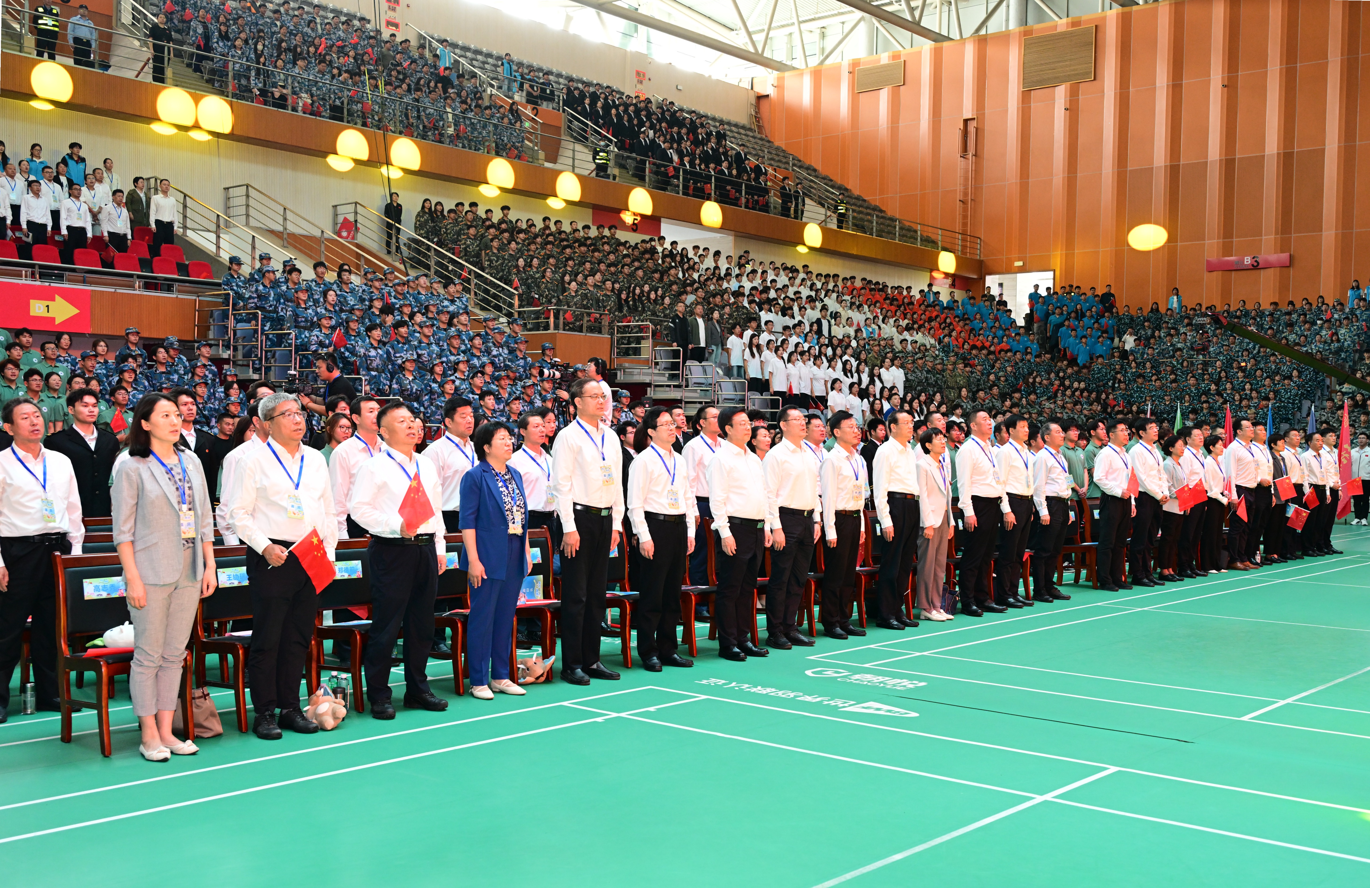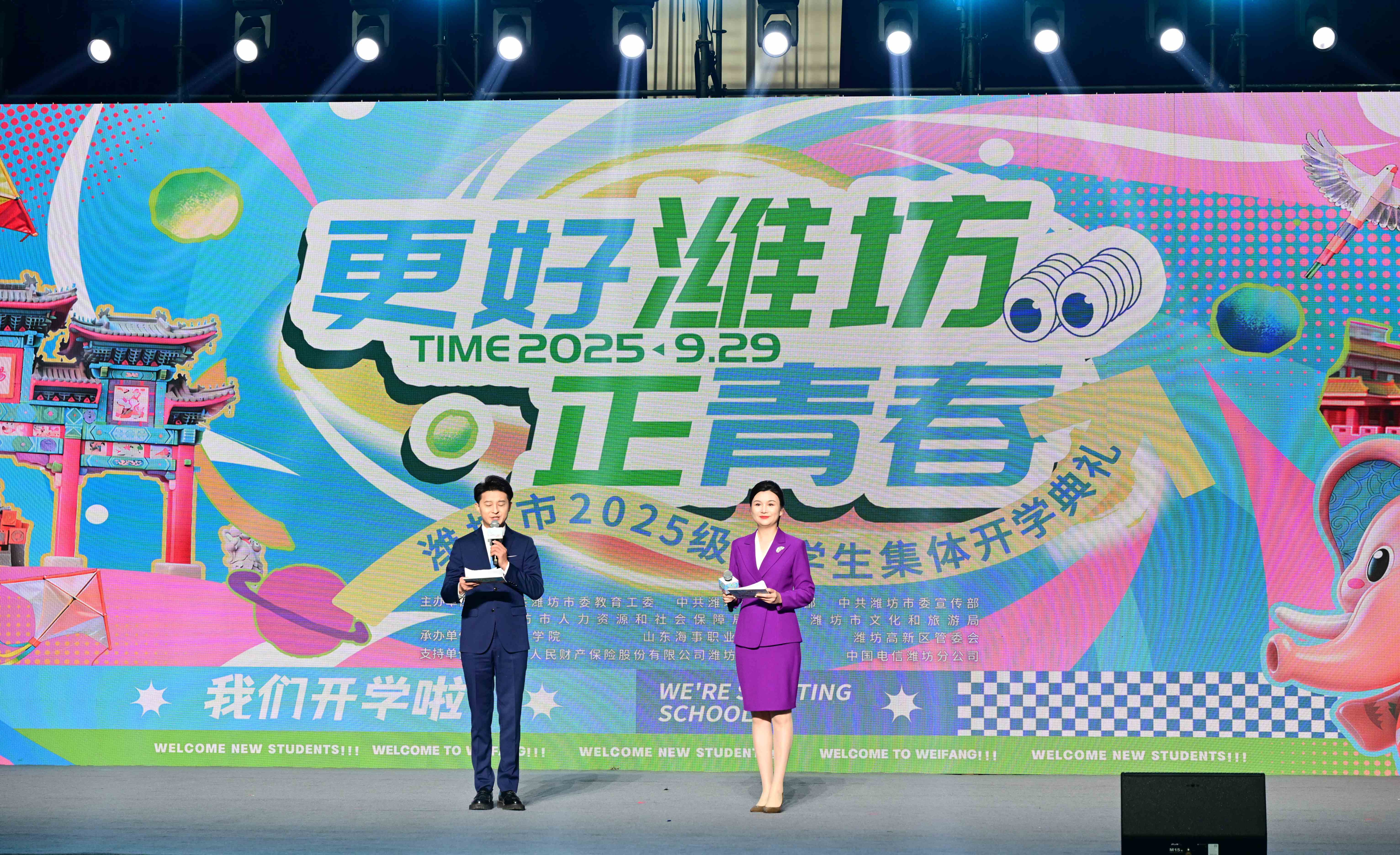 本网讯 9月29日,以“更好潍坊·正青春”为主题的潍坊市2025级大学生集体开学典礼,在学校体育馆举行。市委书记刘运出席并致辞。市领导杨建华、韩幸福、陈端梅、赵文君,学校党委书记来逢波,党委委员、副校长任立春及驻潍高校党委书记或校长、全市2025级新生代表等参加活动。