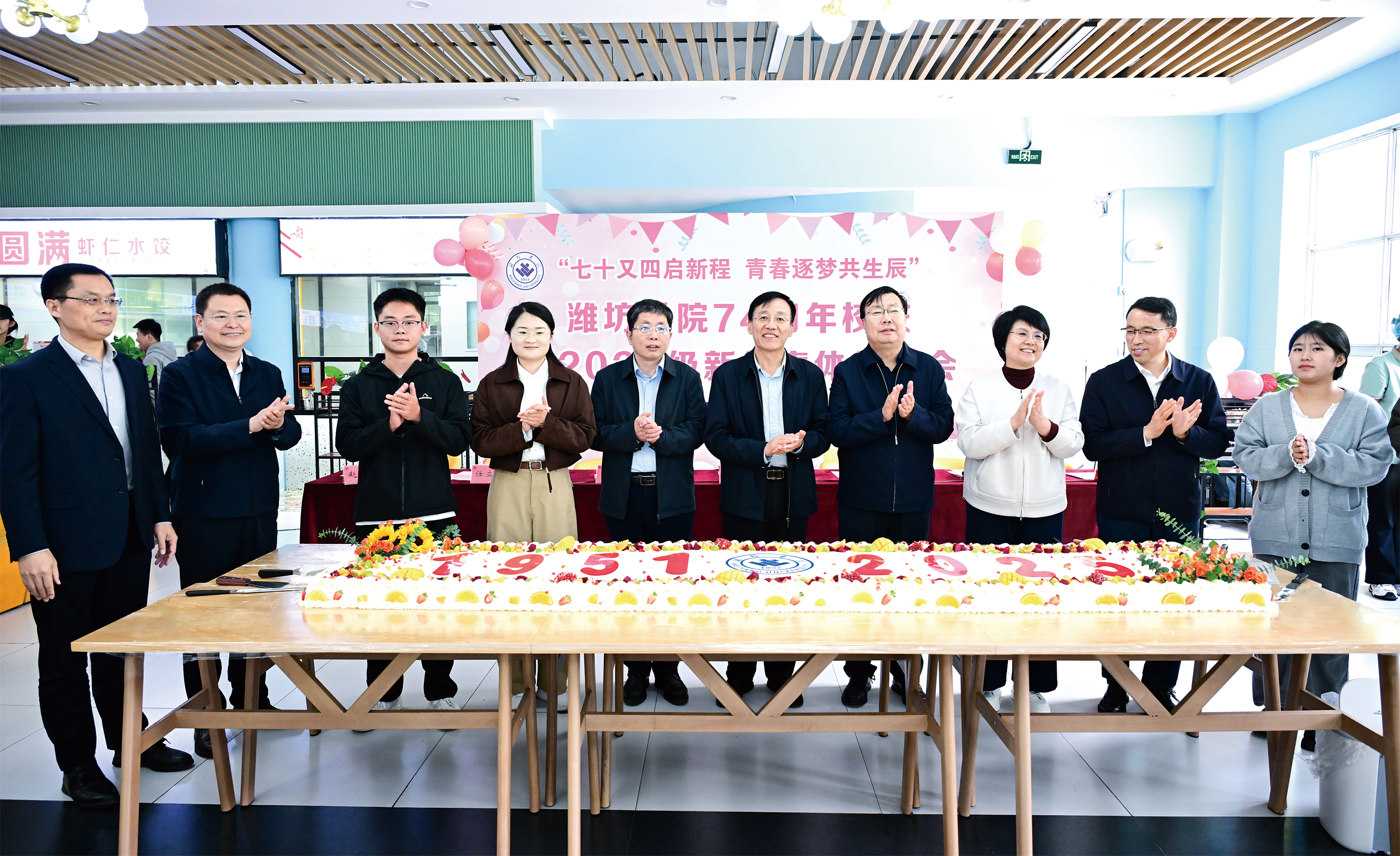 来逢波在致辞中,向当天过生日的新生送上祝福,并深情回顾学校74年发展历程。他指出,在新的历史阶段,学校为每名学子搭建了更加广阔的成长舞台,希望2025级新生珍惜在潍院的学习时光,坚定信念、立志报国,刻苦学习、拼搏奋进,做有理想的追光者,与学校共赴新征程;做善学习的笃行者,在求知路上稳扎稳打;做敢创新的开拓者,在突破中实现成长;做重品德的践行者,让高尚品格成为自觉行动,努力成为可堪大用、能负重任的栋梁之材,让青春在潍院的沃土上绽放光彩。