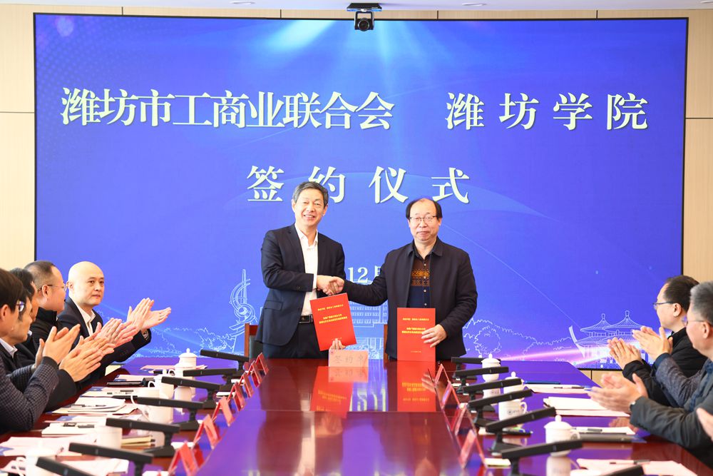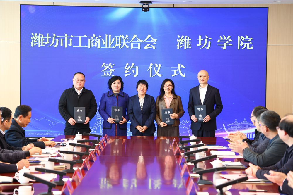 本网讯 12月30日,学校与潍坊市工商业联合会(以下简称“市工商联”)举行全面合作框架协议签约仪式。潍坊市人民政府副市长、市工商联主席陈端梅,学校党委书记来逢波出席活动并致辞。学校党委副书记、校长王霞主持活动。潍坊市人民政府办公室副主任赵昌丽,潍坊市委统战部副部长、市工商联党组书记、常务副主席刘兴成,学校党委委员、副校长李英德出席活动。